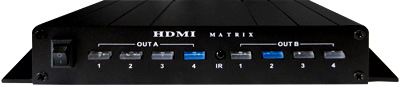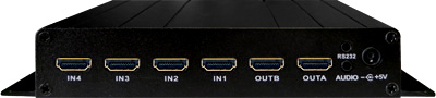 4路HDMI輸入切換到任意2路矩陣輸出 模擬立體聲音頻輸出 面板直接切換、紅外遙控切換、RS232切換