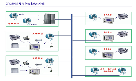 • XY2800-N系列網絡中控主要功能(網絡控制部分)? 多媒體教室遠程開啟/關閉通過總控制室,可以對多媒體教室進行遠程啟動,從而讓教師上課前,設備即進入預備狀態;可以對多媒體教室進行遠程關機,即便教師下課忘了操作,可以很快地被正常關閉,免去了專人和一大把鑰匙。管理員在總控制室、辦公室等任何校園網內都能進行遠程控制。
