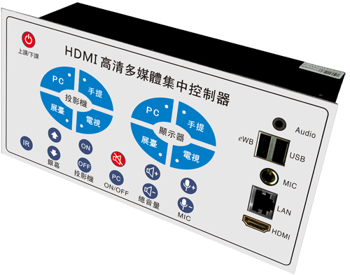 4路HDMI信號輸入,分辨率1920*1080 2路HDMI矩陣切換快速輸出 4路音頻信號同步輸入,1路音頻信號切換輸出 USB長線白板驅動 3路RS232輸出,可控制投影機、電視機等設備 3路強電輸出,可供投影機、銀幕及電腦等設備。 1路紅外控制輸出 具有線路數字音量控制 具有話筒數字音量控制 可擴展2*50W數字功放輸出