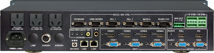 ?4HDMI輸入,3VGA輸入,2HDMI輸出,2VGA輸出,可擴(kuò)展為矩陣輸出
